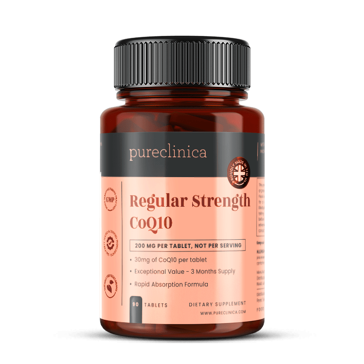 Regular Strength CoQ10 contains 30mg of pure CoQ10 per tablet along with 5mg of black pepper extract for increased absorption. These are a value version containing the most common  daily dose of CoQ10