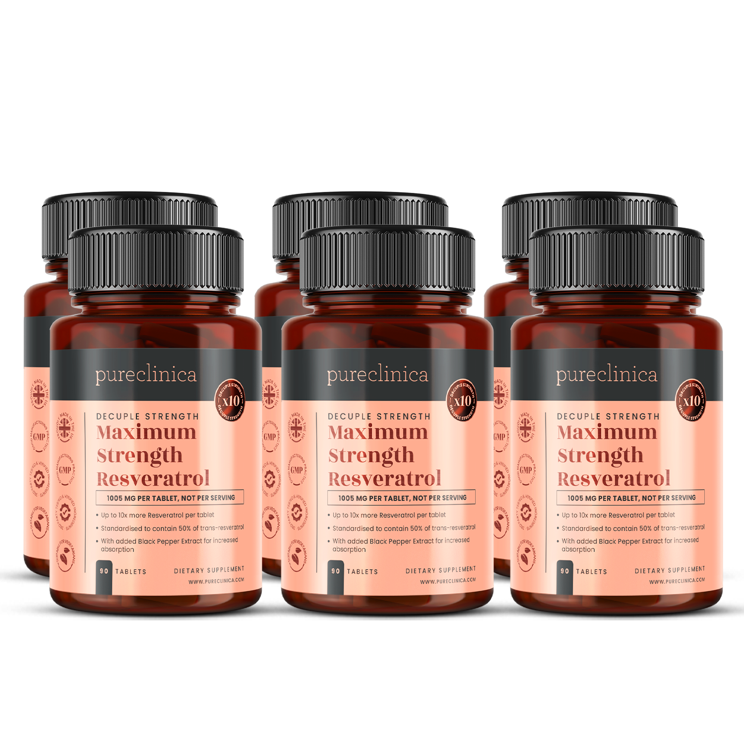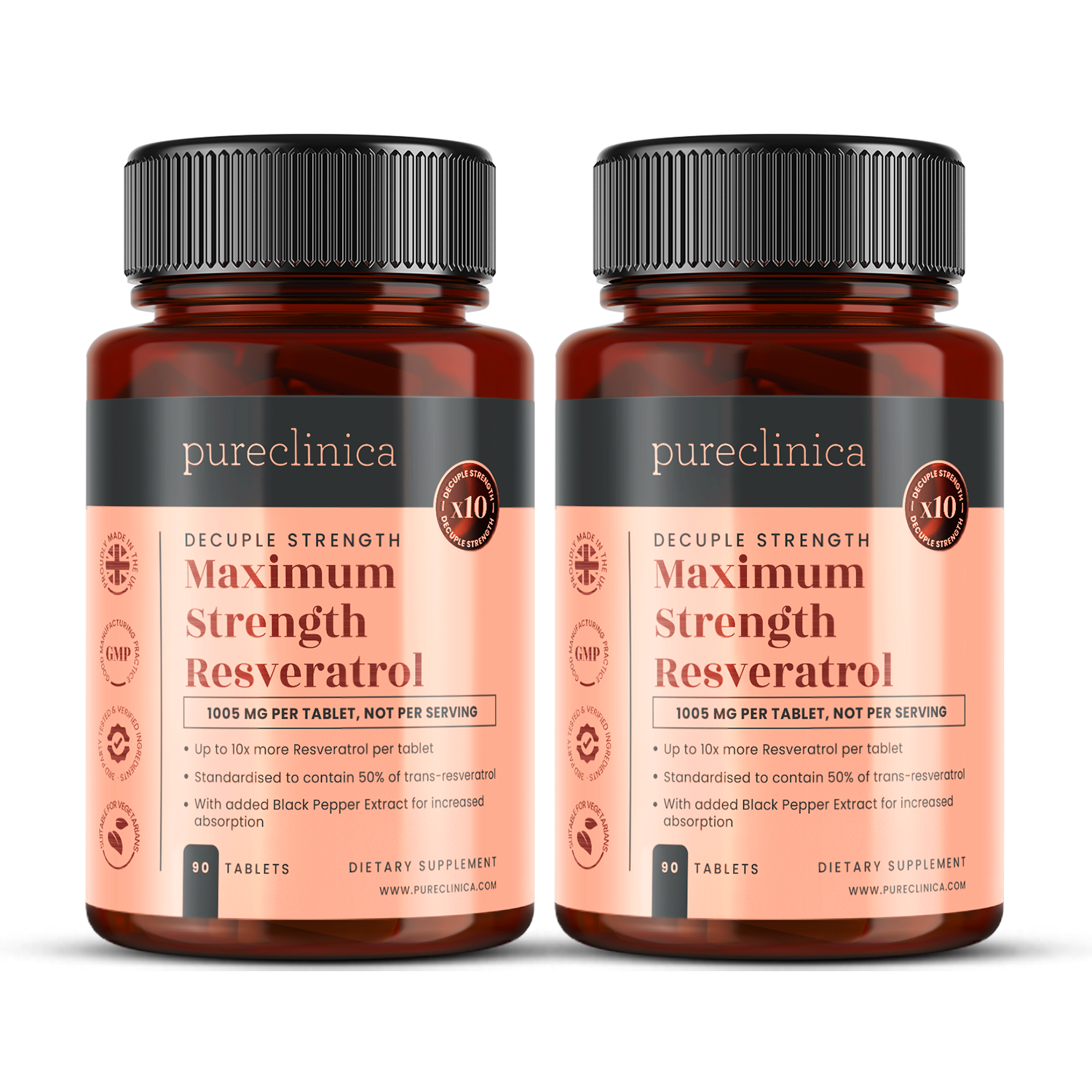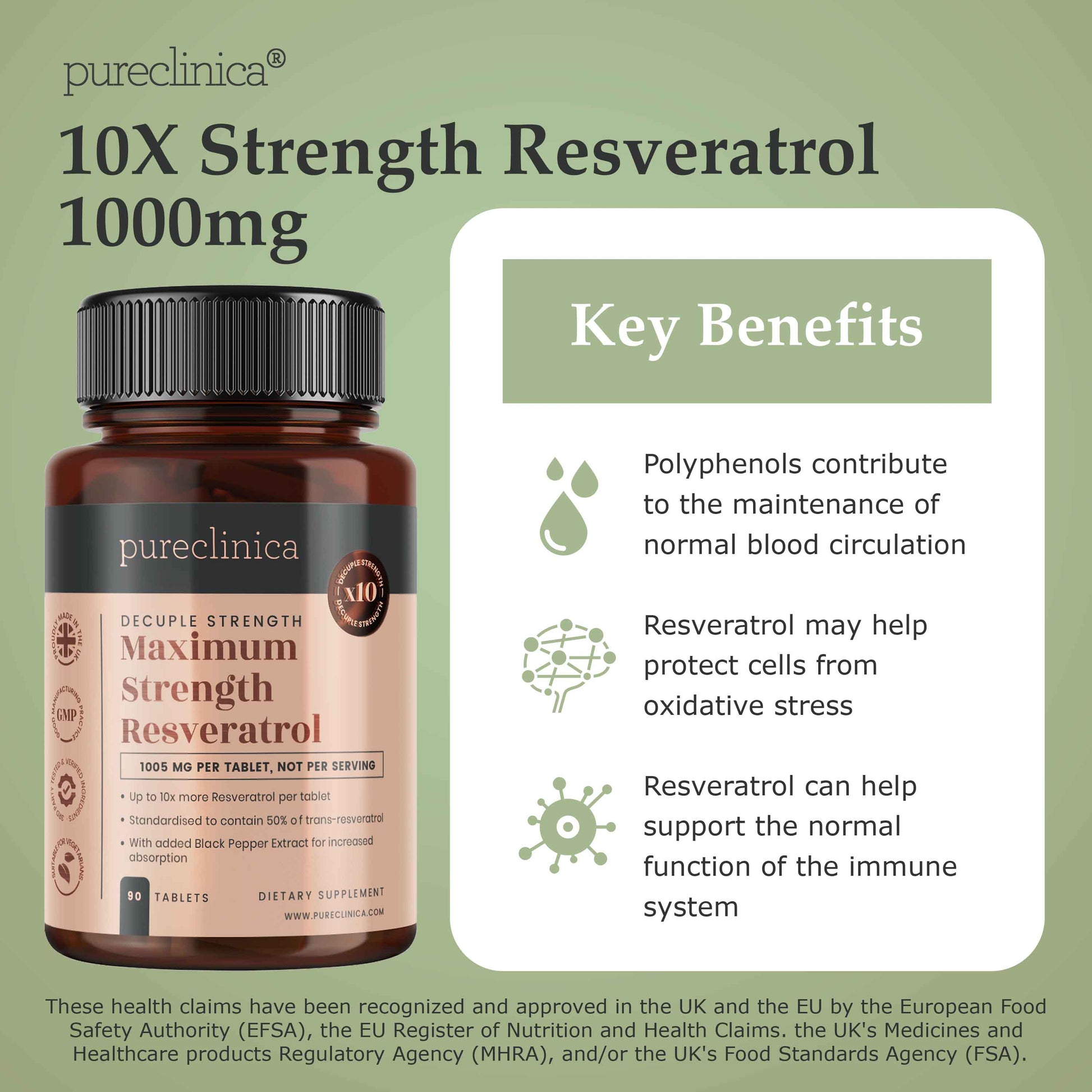 1,000 mg of Resvera-50® resveratrol per tablet, delivering a tested 50% trans-resveratrol, get a 10x strength dose compared to high street alternatives at a fraction of the price.