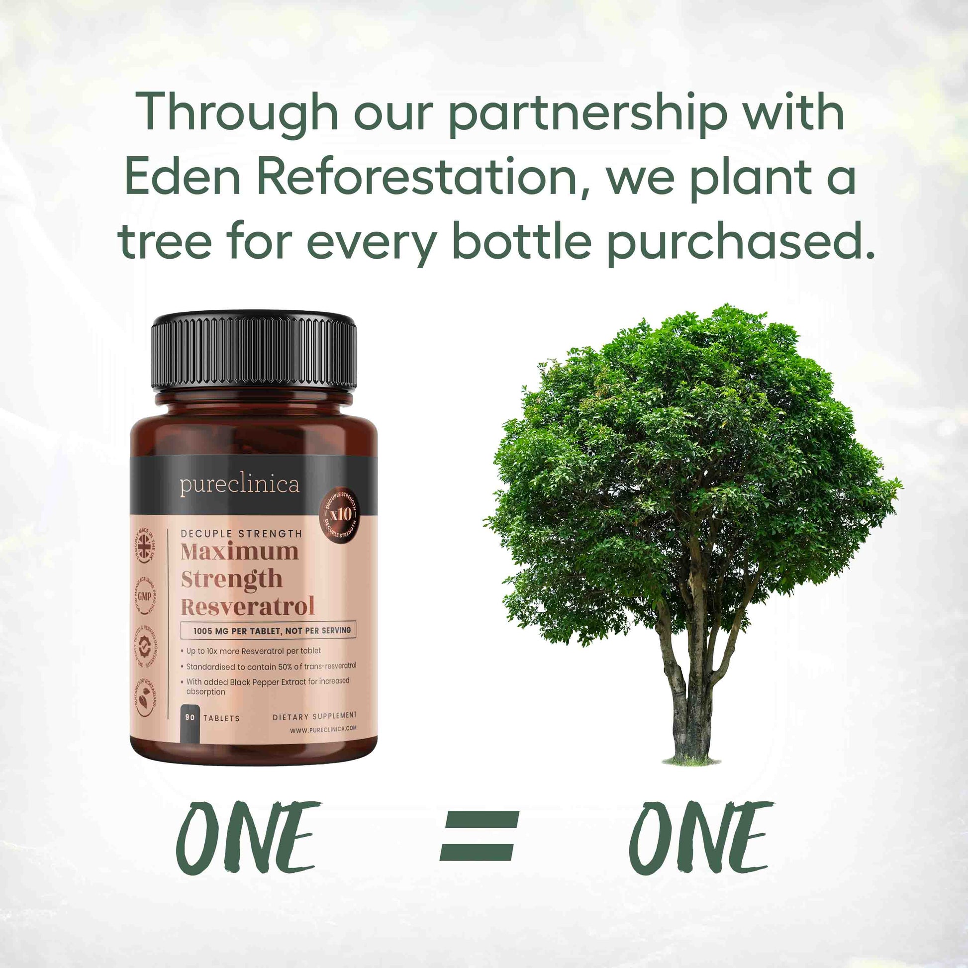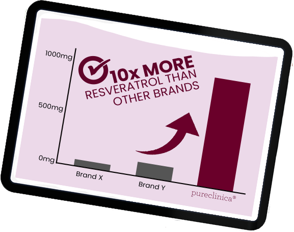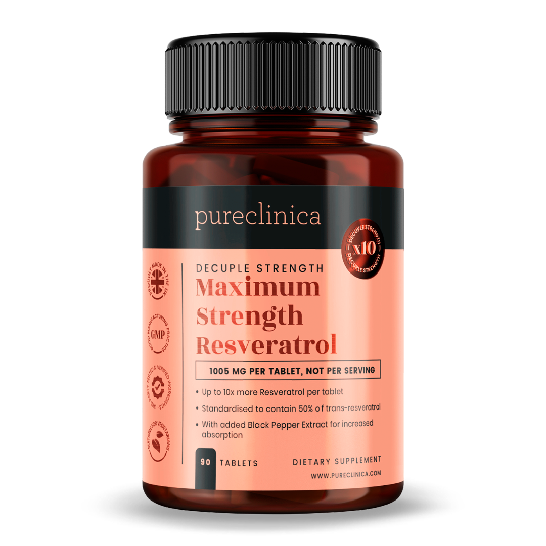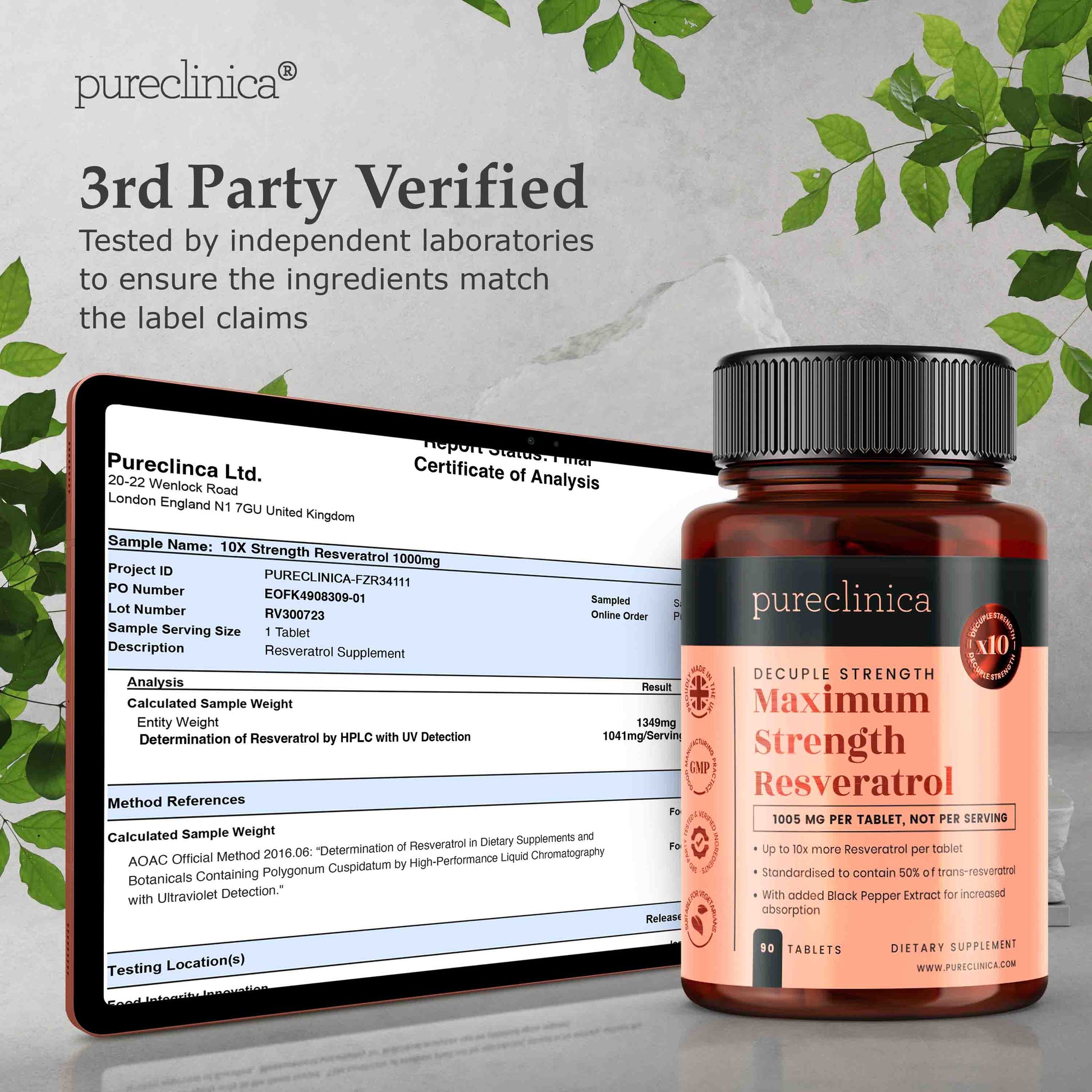 1,000 mg of Resvera-50® resveratrol per tablet, delivering a tested 50% trans-resveratrol, get a 10x strength dose compared to high street alternatives at a fraction of the price.