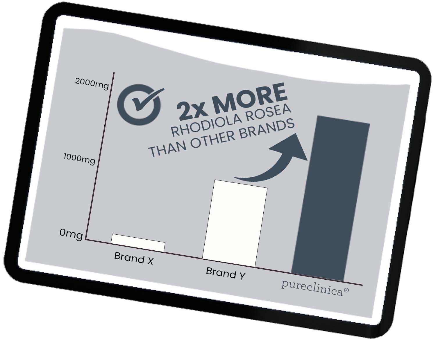 Each tablet provides 500mg of concentrated Rhodiola extract, the equivalent of 2000mg of rhodiola root, and a 2X dose compared to regular rhodiola supplements.